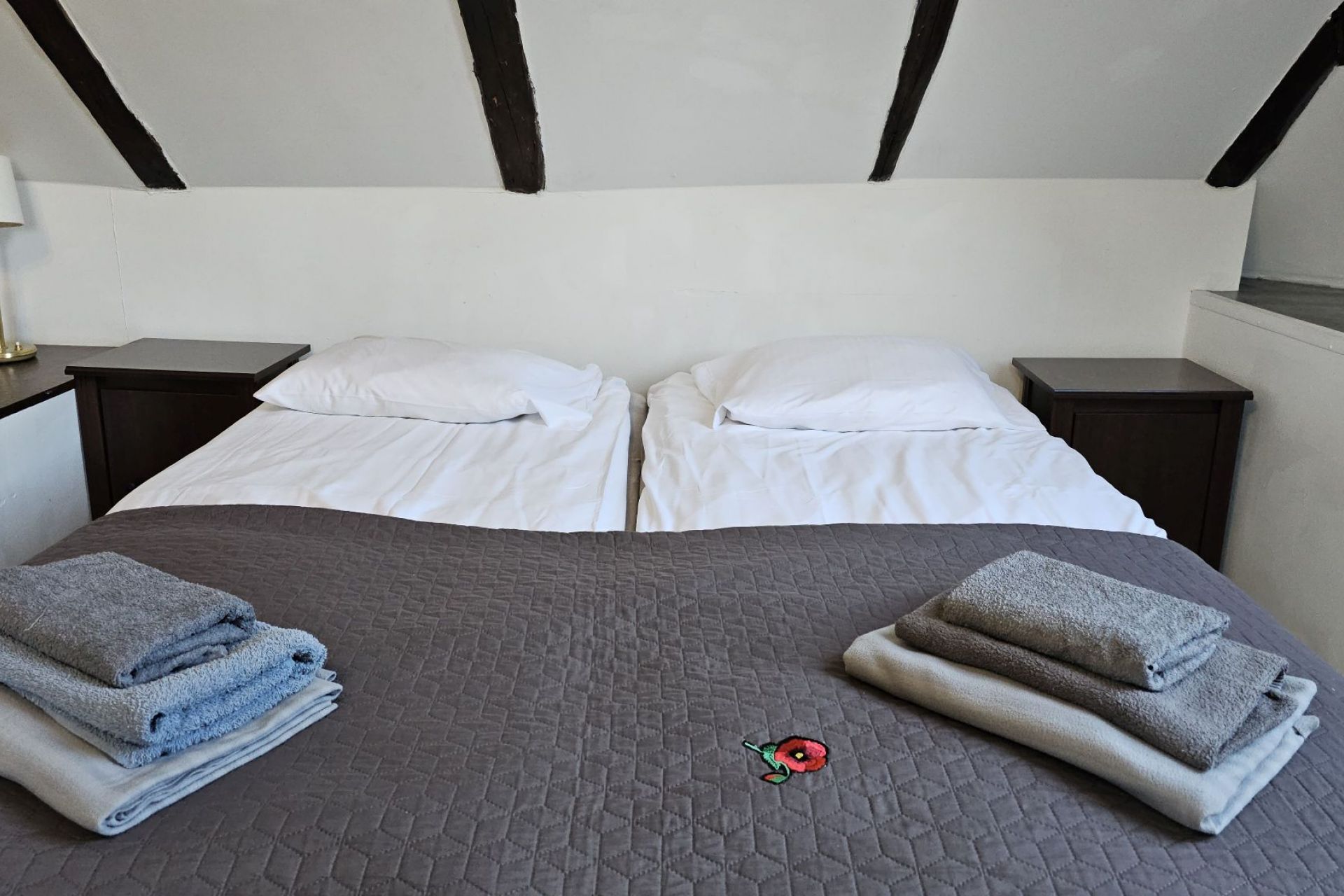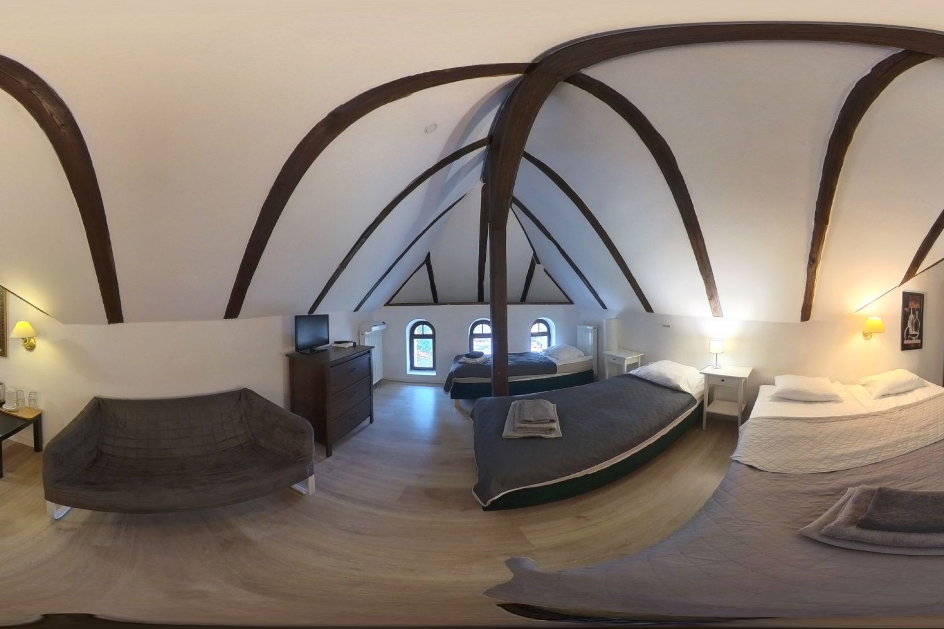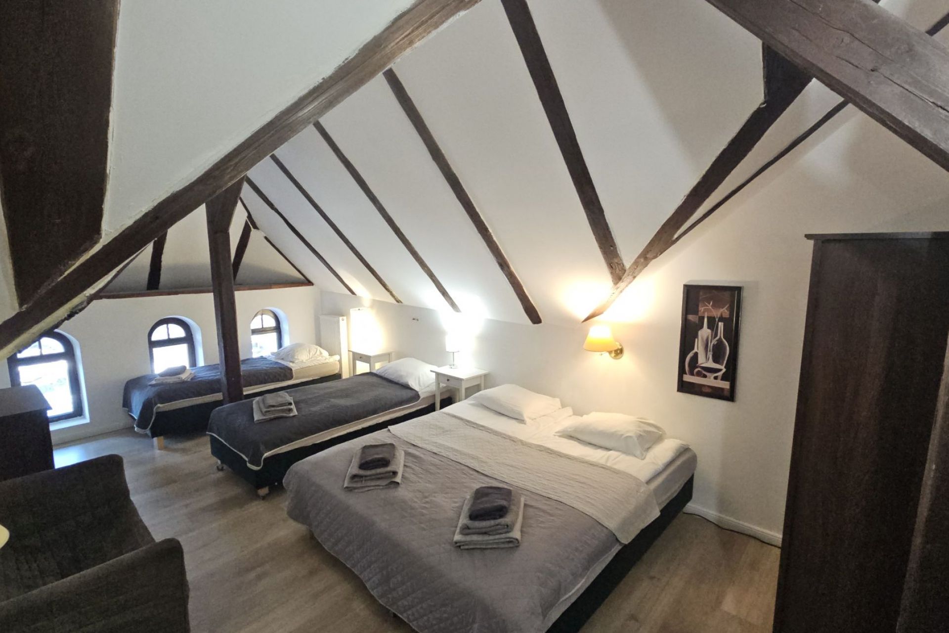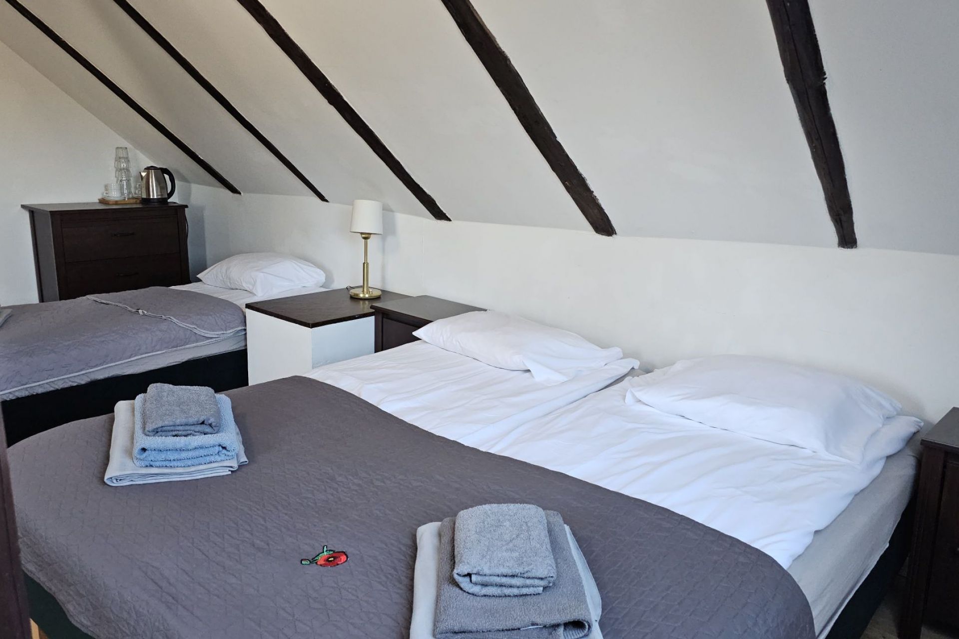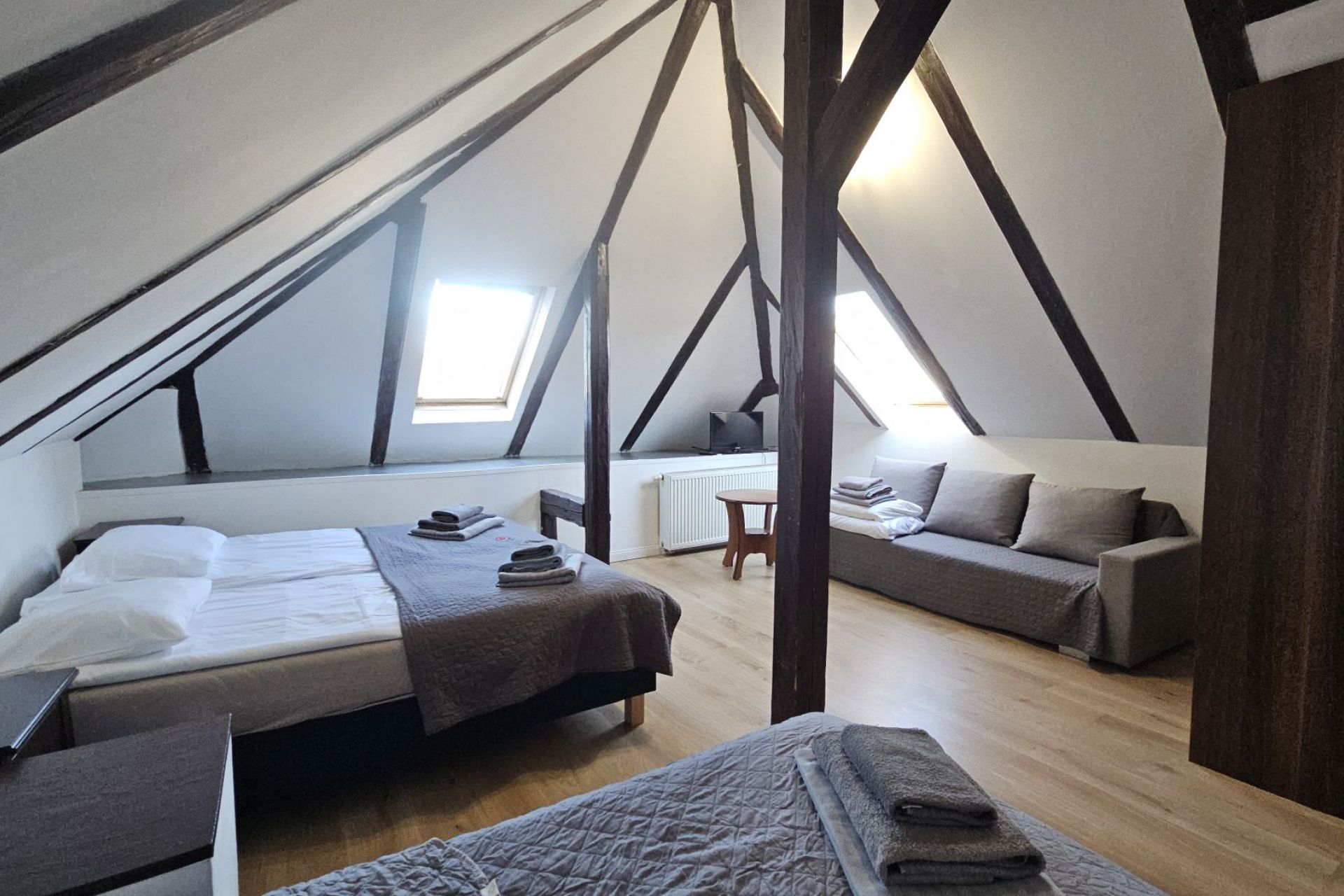 Przeznaczony dla 2 osób dorosłych oraz 2 dzieci. Pokoje usytuowane są na II i III piętrze. Charakteryzują się skosami. Wyposażenie pokoju stanowią: WI-FI, czajnik, szklanki, lodówka. Na łóżkach czekają ręczniki dla gości. Na powitanie teczka reklamowa a w łazience mamy dodatkowo suszarkę.