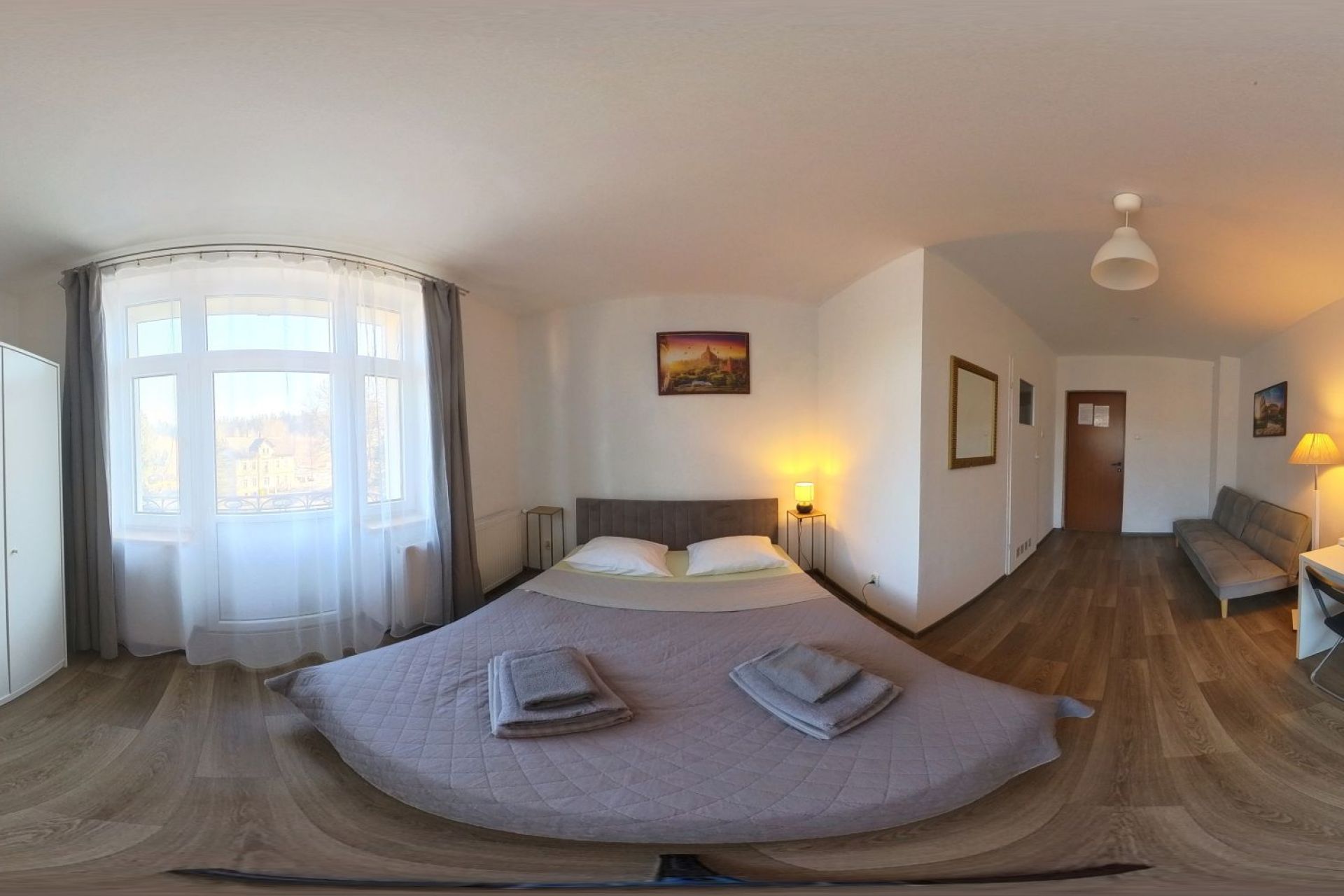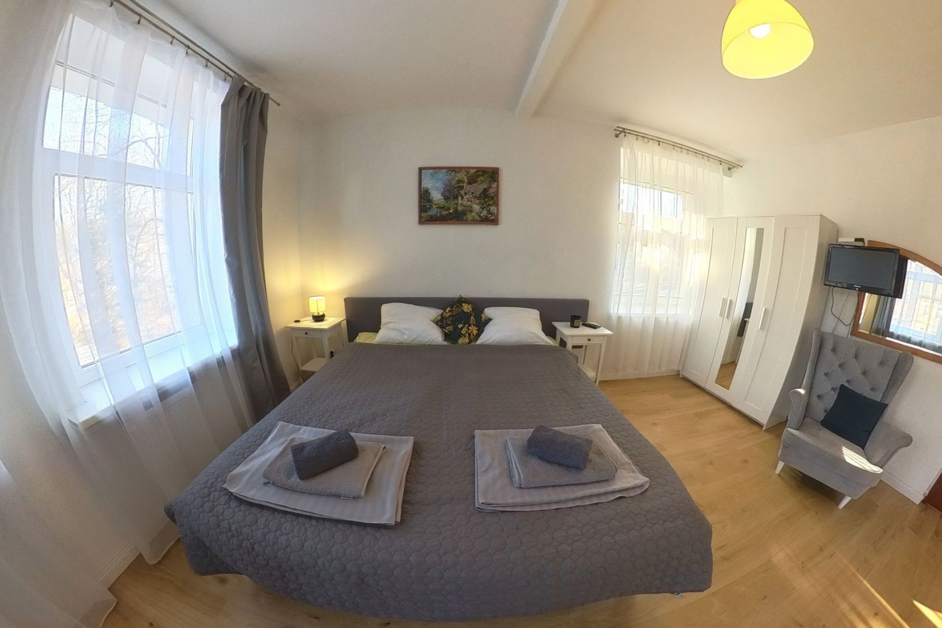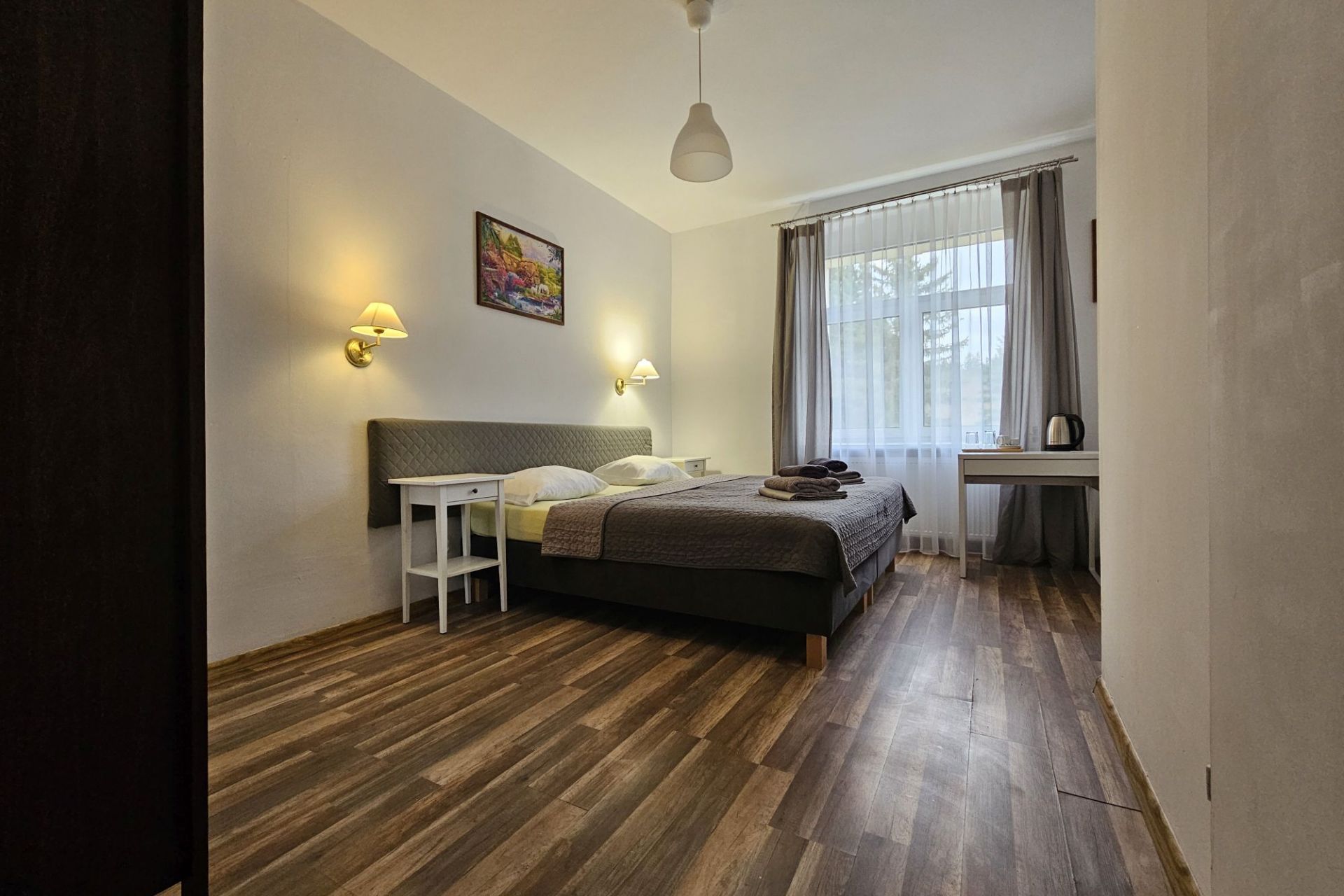 Przestronne pokoje z dwoma łóżkami pojedynczymi. Pokoje De Lux oferują podwyższony standard – wszystkie wyposażone są w kanapy, a część z nich ma układ typu studio (salon + sypialnia). Cztery pokoje De Lux posiadają balkony. W łóżkach te pokoje mają - po 2 poduszki na osobę. Wyposażenie pokoju obejmuje: Wi-Fi, czajnik, szklanki oraz lodówkę. Na łóżkach czekają przygotowane ręczniki dla gości. Na powitanie oferujemy wodę mineralną, herbaty. Łazienki wyposażone są dodatkowo w suszarkę do włosów.